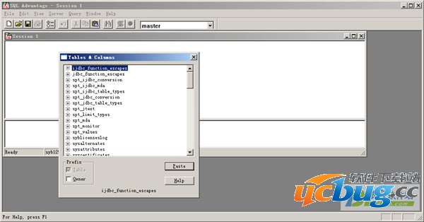 成功连接到Sybase服务器后,查看数据库内的表,点菜单View>Pick Lists>Tables & Columns