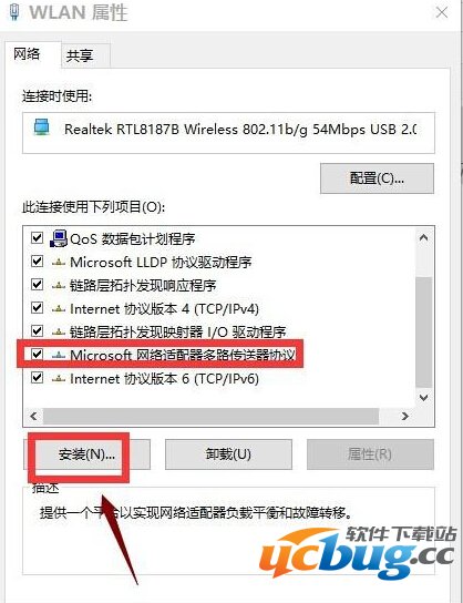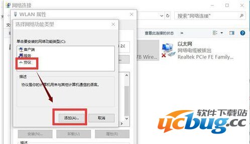打开网络共享中心-当前网络连接属性-选择协议,点击安装