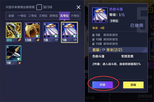 点击进入装备页面,选择需要升级的装备,再点击下方的升级按钮,消耗经验书或者其他装备即可给装备进行升级。