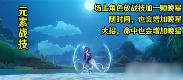 元素战技「垂裳端凝之夜」,脱手护盾+脱手挂冰。释放时对周围造成冰元素伤害(河面都冻结了)并展开一个冰盾。从演示来看,期间有3种方式产生晚星:当前场上角色释放元素战技;随时间增加;大招命中产生。并在晚星达到4枚时转化为自动索敌的飞星发射出去。通过读秒观察,护盾持续时间至多12秒。