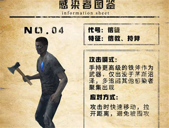 明日之后手游信徒感染者在哪里?明日之后手游是一款以病毒爆发后的末日为背景打造的热门生存类手游,很多的玩家都被游戏中的玩法所深深吸引,许多的玩法都可以让玩家邀请好友一起组队参与体验。在明日之后手游中,有很多的地图,而在这些地图中除了有非常多的资源可以获取之外,同样也有很多的感染者存在,可谓是机会与危险并存,玩家想要获取资源就需要冒着被感染者追赶的可能,所以最好带上武器防身。在明日之后手游中,每位玩家都有一本拥有各个感染者的档案图鉴,方便大家辨别游戏中的不同感染者,其中信徒感染者是一个只位于茅斯沼泽的感染者,是一个普通的感染者怪物,没有什么特殊的攻击方式,下面就让小编给大家带来明日之后汇总新图感染者的图鉴介绍吧。