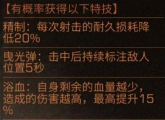 每次射击的耐久度损耗降低20%;击中敌人后标记敌人位置5秒;自身血量剩余越少,造成的伤害越高,最高提升15%;被击中的非建筑单位,护甲值降低2点。