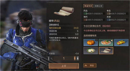 由于绷带制作成本较低并且贡献值加成较高,因此幸存者们只需上交112个绷带,即可领取60个纪念币的最高奖励。