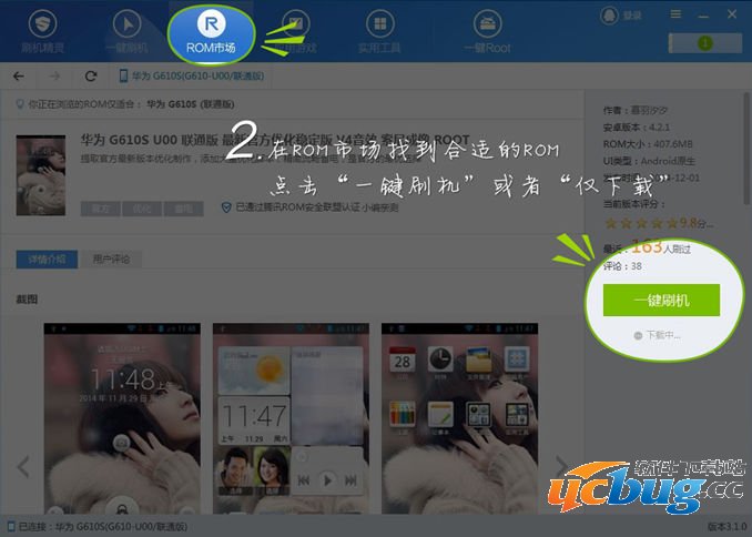 如果您还没有下载ROM包,则点击"前往下载",在ROM市场中选择喜欢的ROM,点击“一键刷机”按钮,即可开始下载ROM包。