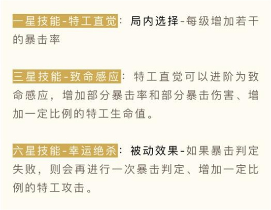 【三星技能】致命感应:将特工直觉进化为超武,增加部分暴击率和部分的暴击伤害还有部分的生命上限。(根据描述来看,技能的数值增加应该不会太高)